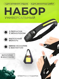 Набор фонарь налобный аккумуляторный, перчатки и брелок DOMME